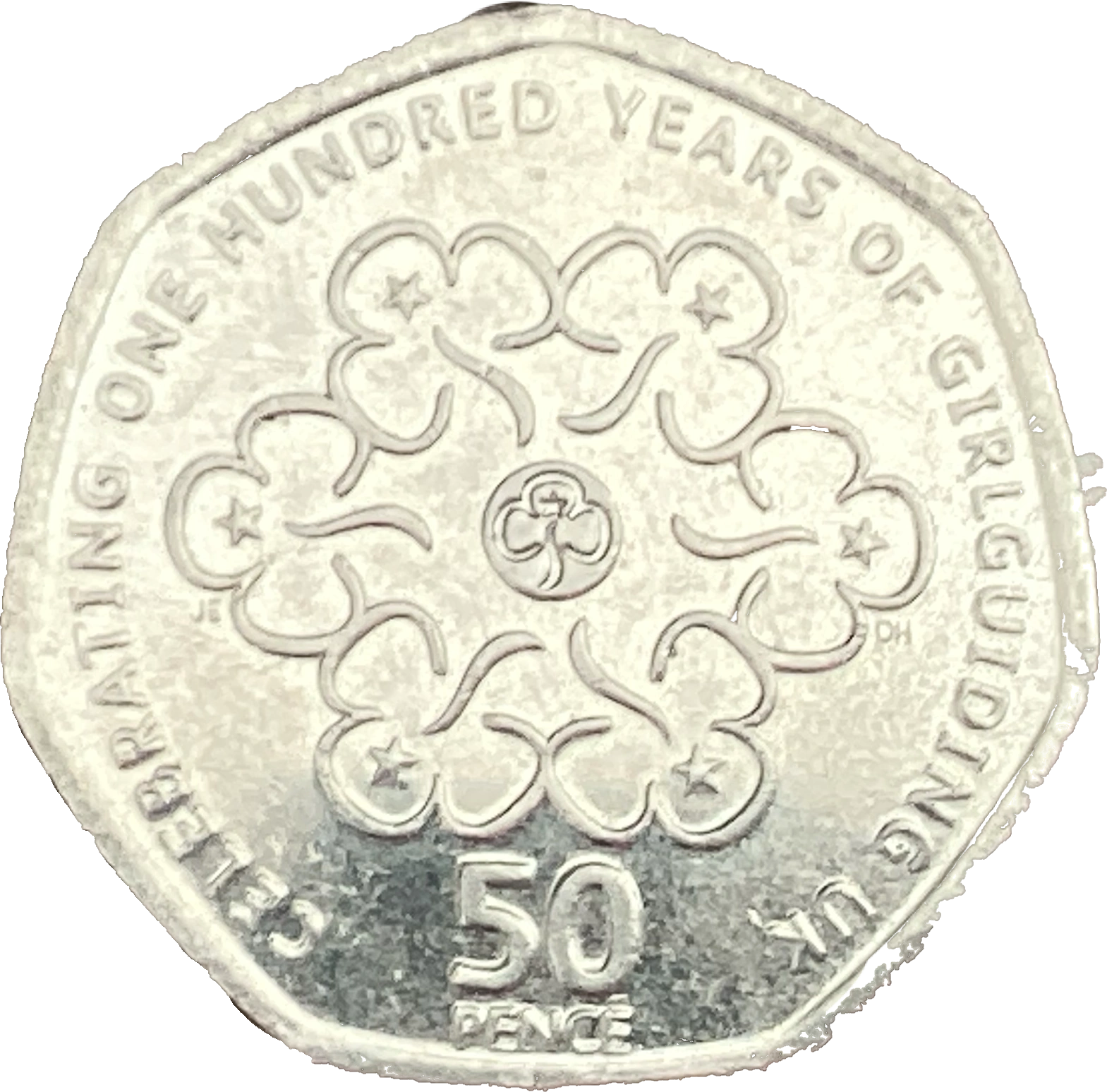 The 100 year's of Girlguiding coin is a 50 pence coin made in the United Kingdom in 2010. The coin was to celebrate 100 year's of the Girlguiding which was created in 1910 by Baden-Powell & Agnes Baden-Powell, is a guiding organization in the United Kingdom witch does different activities for girls, Similar to the Boy Scouts . In 2010 the British Mint made a Special 50p for Girlguiding to celebrate its 100 year's of service.